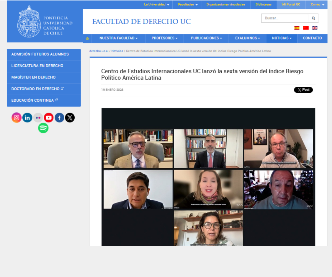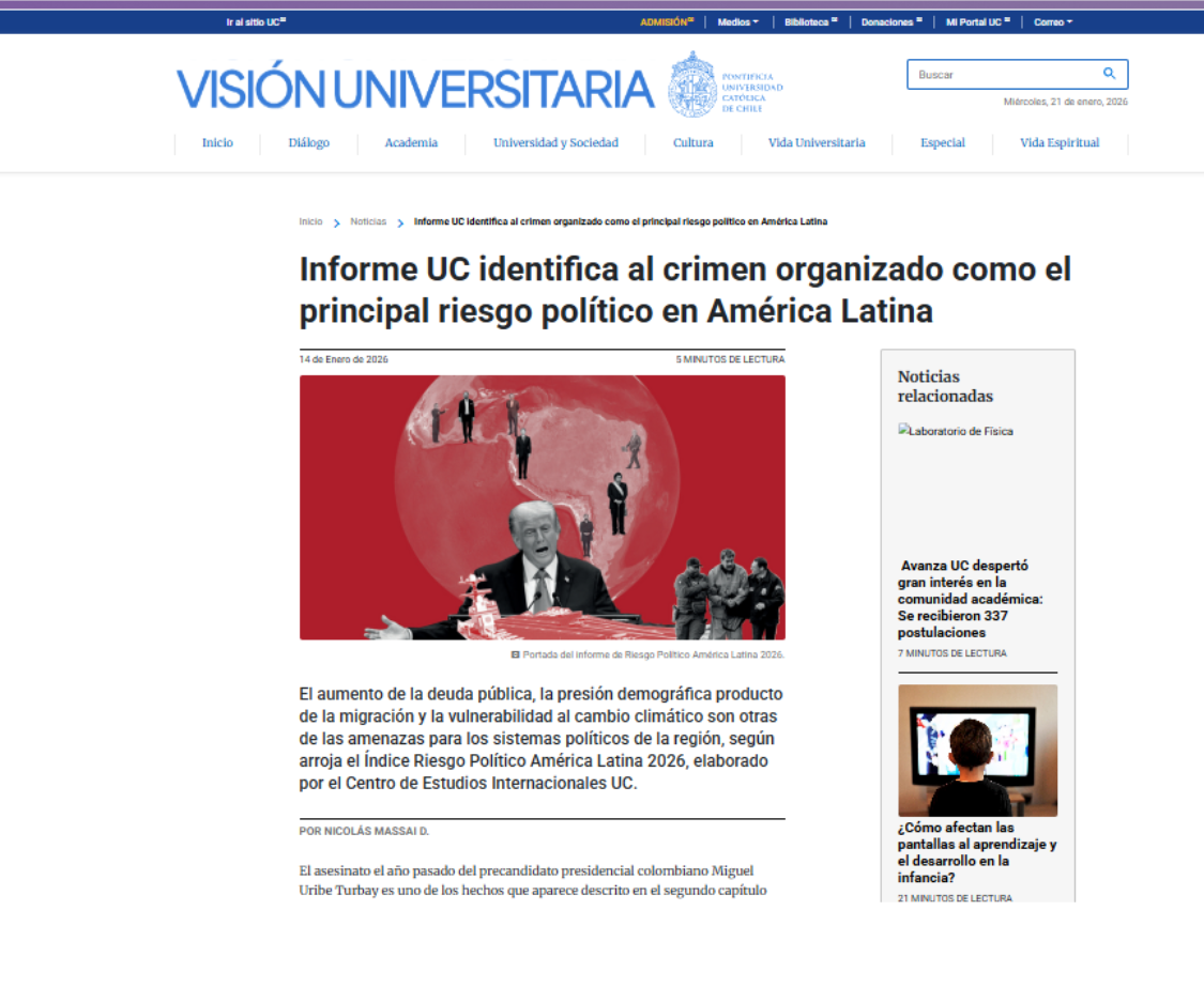 12 Enero 2026 Derecho UC destacó el lanzamiento de Riesgo Político 2026 12 Enero 2026 Informe UC identifica al crimen organizado como el principal riesgo político en América Latina 12 Enero 2026 América Latina 2026: el tablero se mueve y los riesgos políticos suben la apuesta
