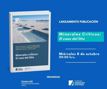 El miércoles 8 de octubre a las 09:00 horas se lanzará la publicación “Minerales Críticos: El caso del litio” en la Facultad de Derecho de la Universidad Católica. La actividad, organizada por el Centro de Estudios Internacionales UC (CEIUC) junto a la Fundación Konrad Adenauer en Chile (KAS), reunirá a especialistas que analizarán la gobernanza y el futuro del litio como recurso estratégico.